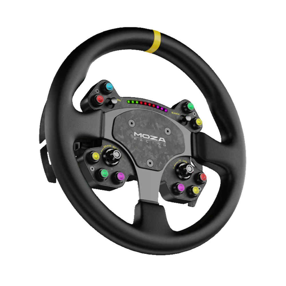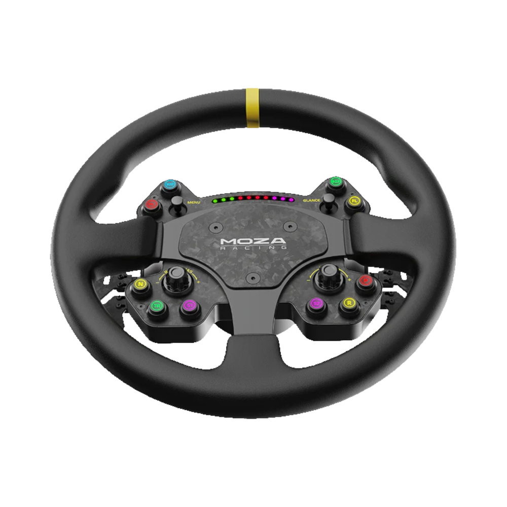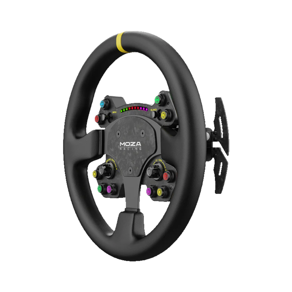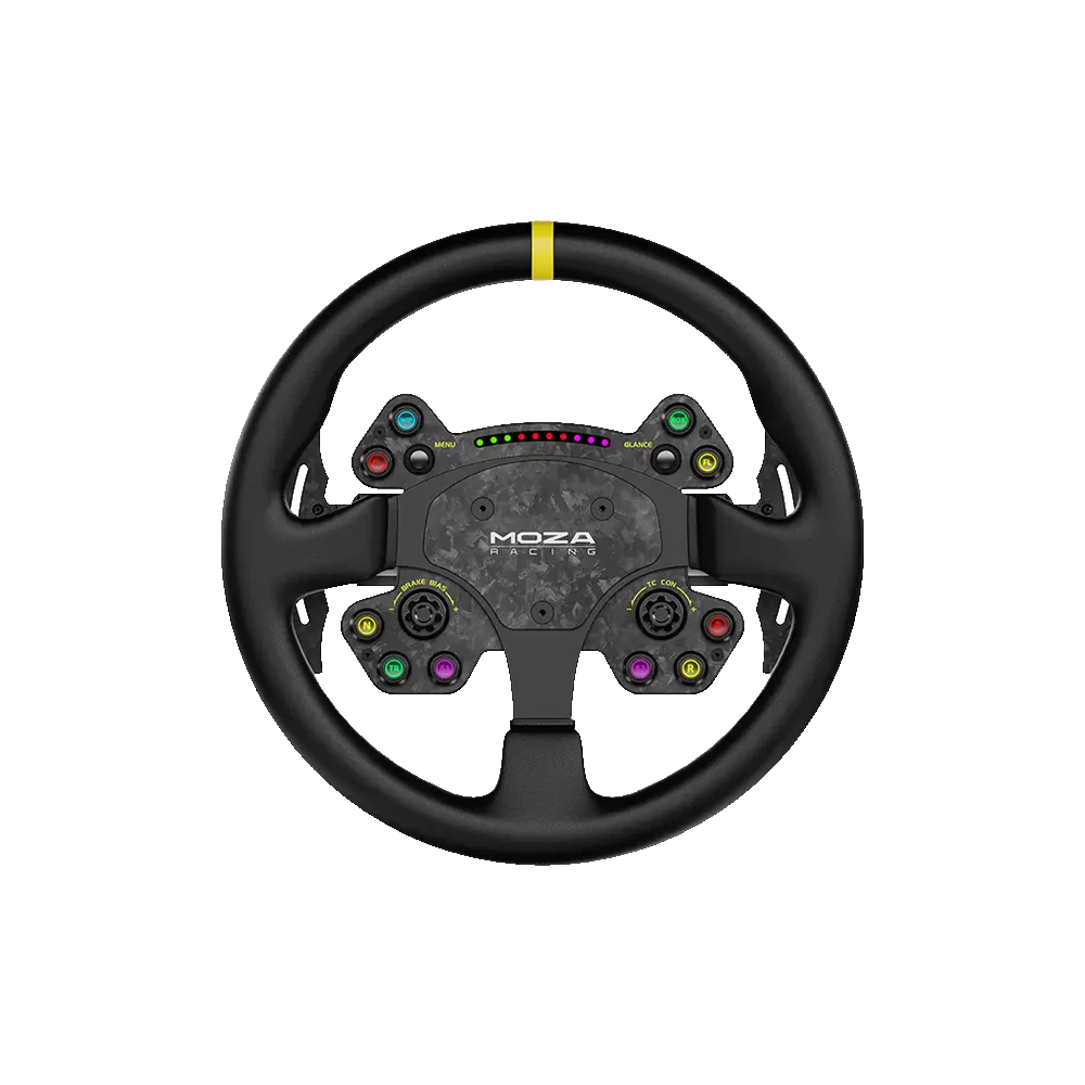 Mejora tu configuración de carreras de simulación con el volante de carreras de simulación RS. Este volante GT ofrece compatibilidad con todas las bases direct drive de MOZA, integrándose a la perfección para una experiencia de carrera optimizada. Construido con una combinación de fibra de carbono forjada y aluminio, garantiza resistencia y elegancia. Disfruta del volante de carreras estándar de 13 pulgadas con un diseño ergonómico para la máxima comodidad durante carreras emocionantes. Adornado con agarres de cuero genuino, proporciona un toque elegante y agradable. Instálalo y quítalo sin esfuerzo con el mecanismo de liberación rápida incorporado y elige entre conexiones inalámbricas o con cable para que se adapte a tus preferencias. La luz LED RGB Rev aumenta tu inmersión en las carreras, mientras que las palancas de cambio magnéticas de fibra de carbono garantizan cambios de marcha precisos.